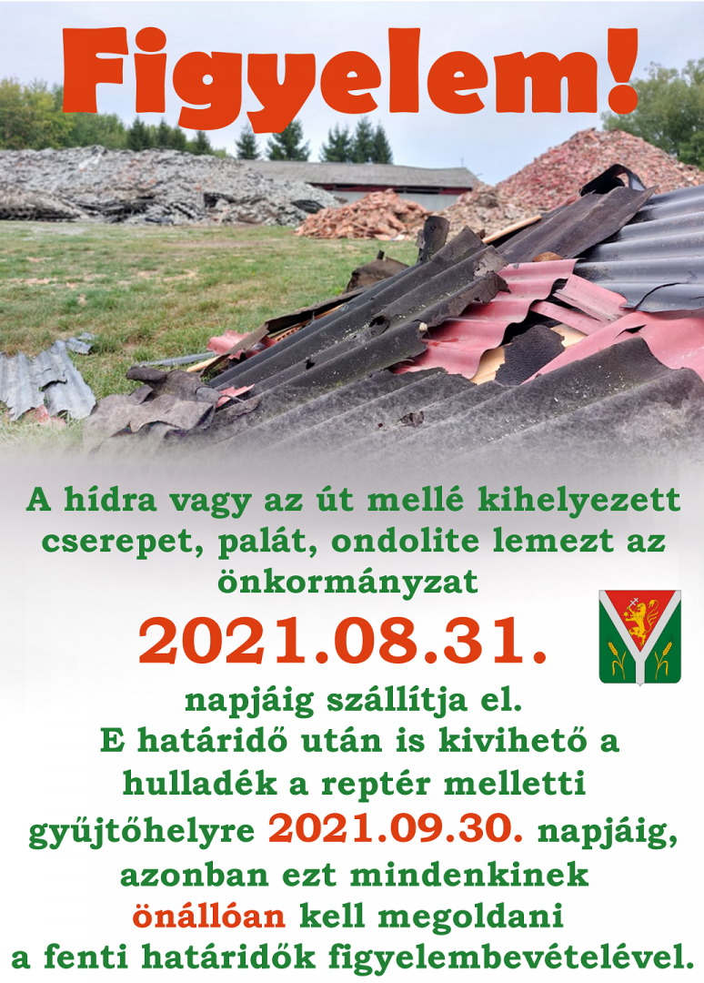 A hídra vagy az út mellé kihelyezett cserepet, palát, onduline lemezt az önkormányzat 2021. 08. 31. napjáig szállítja el.