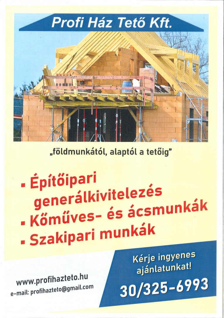 A Profi Ház-Tető Kft. jelezte, hogy településünkön tető helyreállítási munkát vállal vállal. Árajánlatot a 30/325-6993 telefonszámon kérhetnek.